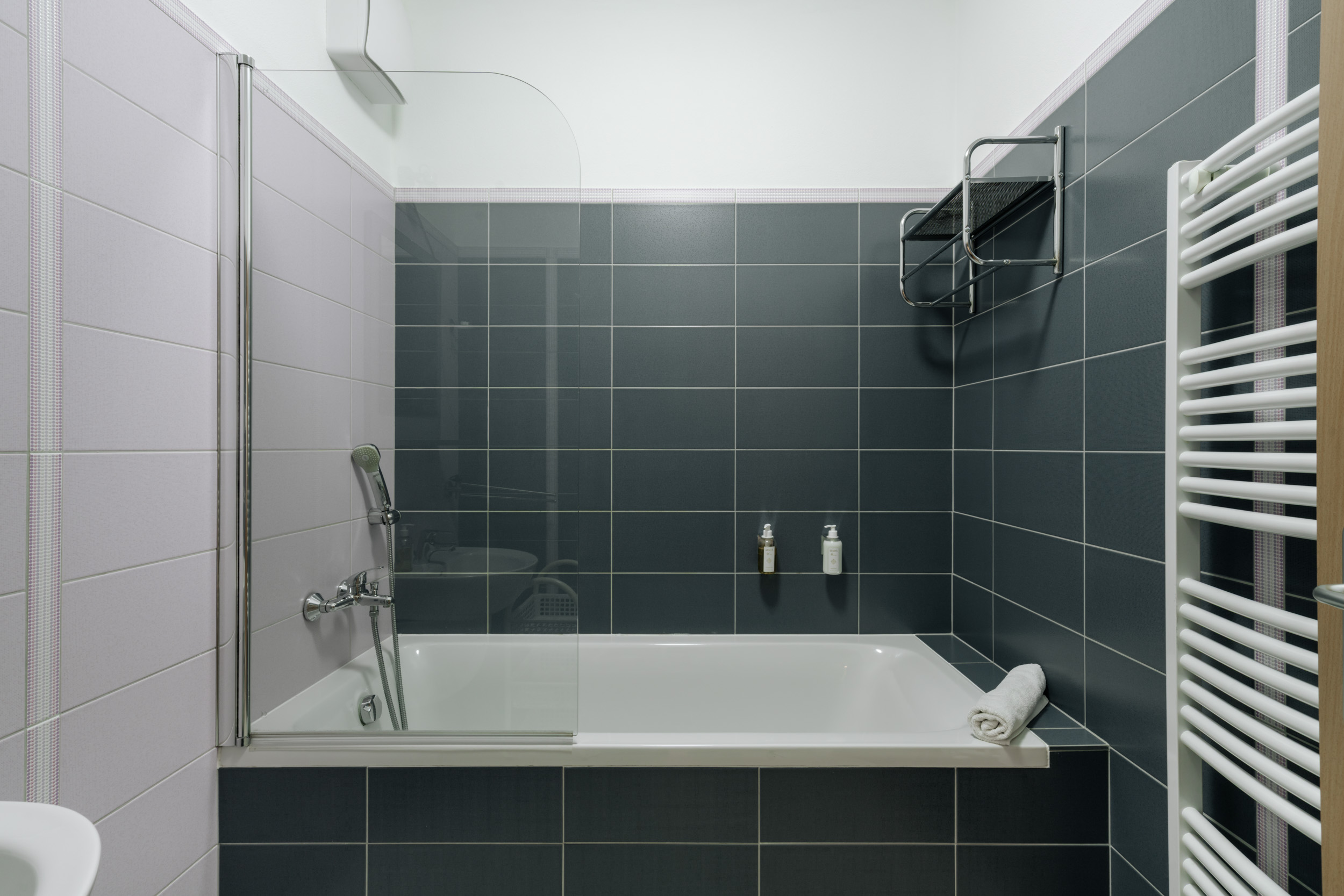 Součástí koupelny je vana a samozřejmostí jsou i ručníky, osušky a toaletní potřeby.